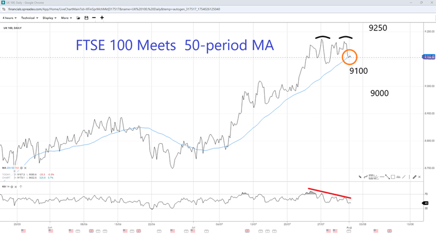 Supported by generally positive earnings so far, the FTSE 100 has trended higher over the last week but has witnessed a recent drop. However, the RSI suggests there could still be some headroom to keep growing despite some signs of a forming double top. A move above the record peak of 9170 could find the next resistance at 9250, while a break higher would expose the 9500 psychological level. On the flip side, further declines below the 50-period moving average at 9100, which is currently holding support, could send the index towards support near the swing low of 9080. If the index fails to form a double bottom, it may encounter support at the psychologically important 9000 level.