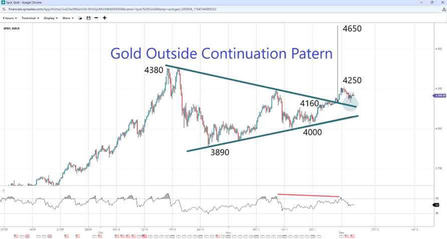 Gold might have left behind a pennant or triangle pattern, forming support at the $4k handle and peaking at $4250 for the time being. A bullish continuation from the breakout point near $4160 would open the door to the measured move projection of $4650, with intermediate resistance at the prior record high of $4380. However, the double-top formation just above $4250 poses a risk for the yellow metal, especially when combined with RSI divergence. Further declines back within the continuation pattern under $4135 would expose the $4k support once again, bringing into focus the late-October trough of $3890. Losing that floor would suggest that the correction from record highs is still ongoing.