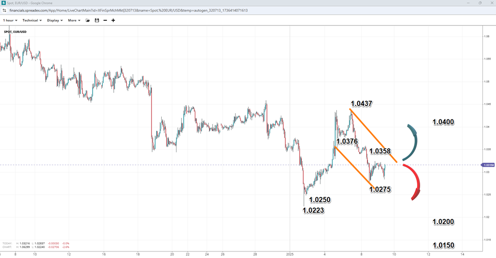 EURUSD kicked off 2025 with an upward trend but has shifted lower since inflation readings started to surface. Flash CPI in the eurozone accelerated as projected by economists and the ECB due to rising energy costs. However, forecasts point to inflation reversing course through early 2025, suggesting . While markets price in four rate cuts in 2025, investor confidence in the ECB holding rates in January has strengthened on the back of the hotter inflation prints. The market also appears to price in a , suggesting sideways price action in EURUSD on stable interest rate differentials. Barring any major surprises from upcoming data releases, .