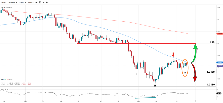 From a technical standpoint, cable trades at a critical junction just shy off the 50-day moving average near $1.26. But an inverse head-and-shoulders reversal pattern could boost the pair up to $1.30 if the neckline at 1.265 and the 50 DMA give way.