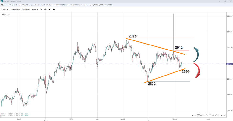 Technically, the consolidation in gold continues to narrow, pointing to a pennant or triangle correction pattern. These two patterns suggest a measured-move target of $3080 per ounce after a successful breakout past $2940 and the record peak of $2945. However, this target may reduce to a lower level if the breakout occurs at a lower point. On the flip side, losing the regional support of $2880 will expose the $2850 swing, increasing the chances of a flag pattern.