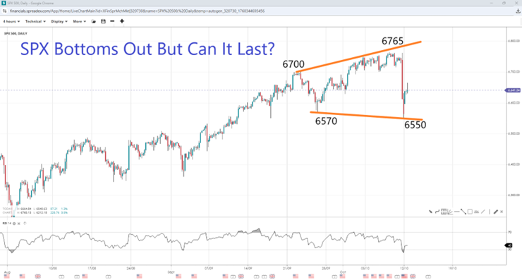 The S&P 500’s drop to 6550 marked a new low not seen since September while forming a double bottom with the September-end trough at 6570. The price action spanning the month of October appears to turn into an open triangle pattern, which would open the door to new highs if 6700 and the peak of 6765 gave way to bulls. However, the 6665 could form a local top, suggesting another decline under the regional support and towards 6500 and 6420. The break of the latter, as it would be over 5% but under 10%, would imply a short-term market pullback.