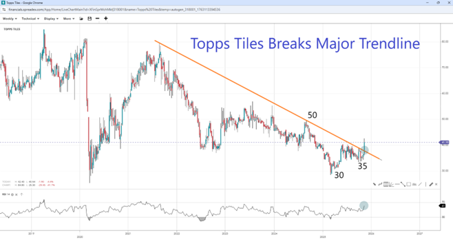 TPT has broken above a long-term trendline near 37 GBX and reclaimed the 40 GBX handle after nearly a year. If bullish momentum extends towards 70 on the weekly RSI, the stock could accelerate towards the 50 GBX round resistance, which led the latest declines at the end of 2024. However, a fall back below the major trendline could potentially expose the Covid-crash bottom near 35 GBX.