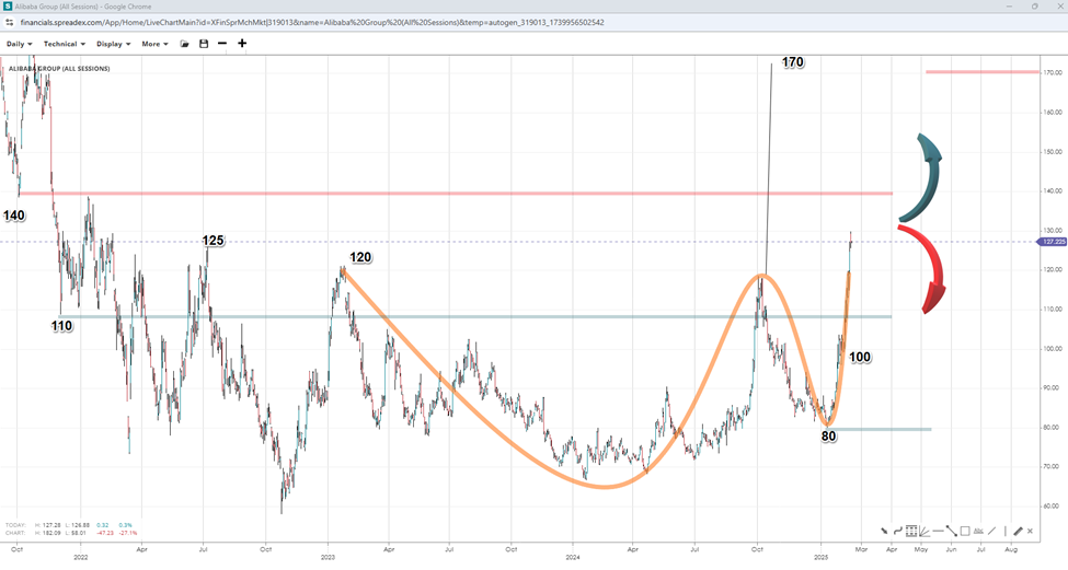 The technical picture for BABA reveals an interesting junction, with a cup and handle (C&H) pattern potentially setting the stage for a move higher. As projected by the measured move, a sustained breakout above the handle resistance at around $120 could propel prices up to $170. Interim resistance sits at the $140 handle. Conversely, a breakdown below $110 could expose double digits below the $100 round support, signalling a deeper correction with $80 as a last point of hope.