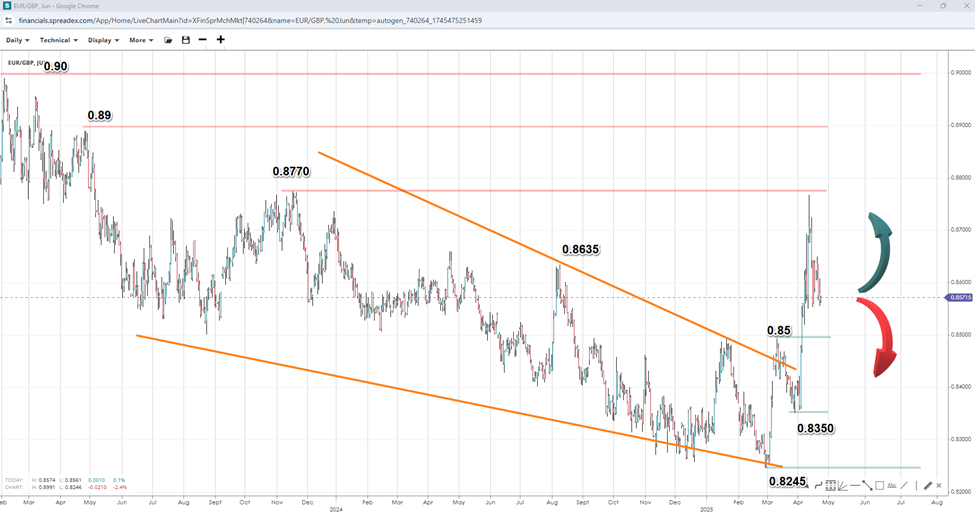 Despite Cable nearing a 3-year high, the pound is falling against the euro, with the EURGBP pair reaching its highest level since November 2023 as traders price in the potential for Softer-than-expected inflation figures in March are driving this expectation. While inflation is expected to pop back up in April due to regulated utility price increases, the latest figures were below the 3% level that the BOE expects inflation to remain above for the rest of the year. The tariff disruption could cause companies to send cheaper goods, which are affected by levies in the US, and contribute to lower inflation in Britain in the coming months.