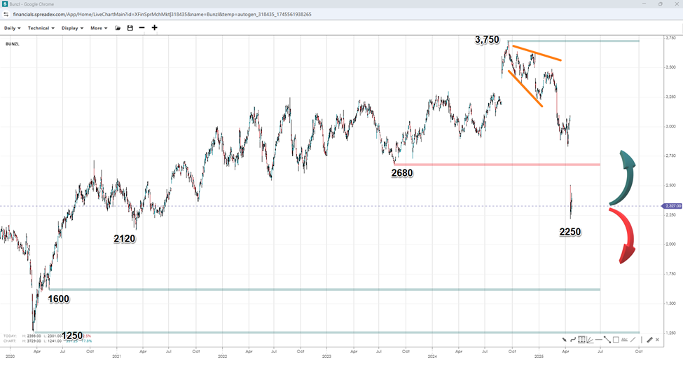 Bunzl's stock appears to have topped out at 3750 GBX and formed a broadening wedge pattern on its way down, which led to an impulse decline to 2250 that could turn into a dead cat bounce (DCB). Staying below 2680 could lead to lower prices, with a target of 2120, which would then open the door to prices below 2000, potentially exposing the low of 1600 and ultimately reaching 1250. Conversely, key resistance to watch above 2500 is set at 2680.