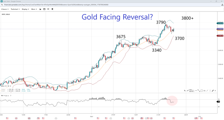 Following a month of steady gains, it appears that gold is taking a pause in response to Powell's remarks. The retracement has brought the RSI back from overbought, but it risks falling back below 50 if gold breaks the lower Bollinger Band at $3700. If gold breaks the lower Bollinger Band at $3700, it may find support at the previous support level of $3675, and a breakdown could lead to the swing low of $3640. If gold resumes its upward trajectory, it could face resistance at the prior record high at $3790 before heading toward the psychologically important $3800 and $3850 handles.