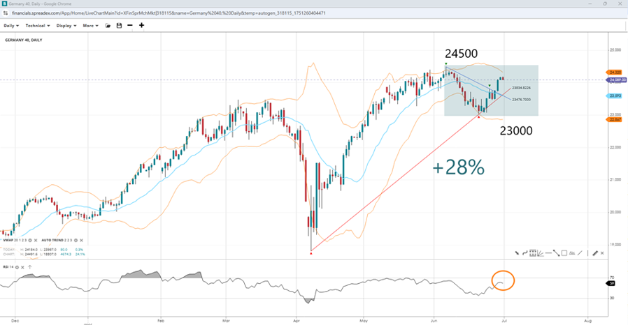 The ceasefire between Iran and Israel, immediately followed by the NATO summit, caused fluctuations in European stocks, with defence stocks initially mixed as American military companies benefited from the conflict. Controversy also arose as Spain secured an exception to the NATO pledge. However, the increase of defence spending to 3.5% of GDP, along with large orders for major military firms like Rheinmetall and Fincantieri, boosted European defence stocks. The German DAX index performed well last week, driven by gains in Rheinmetall and other defence stocks. While the index is trading near record highs, traders are closely watching Tuesday’s inflation data in Europe.