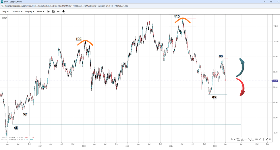 In the aftermath of a golden pocket retest at 65 EUR, BMW hovers around the 75 level following an impulse off the low towards 90. A potential continuation of the trend could extend near 100 to form the right shoulder of a possible head and shoulders pattern. The peak at 115 could signal a bearish reversal once the shoulder forms, leading to the breakdown below the neckline. However, if prices fail to move higher in the short term, losing the support prematurely would expose the 57 and 45 levels, ultimately paving the way for a full reversal.
