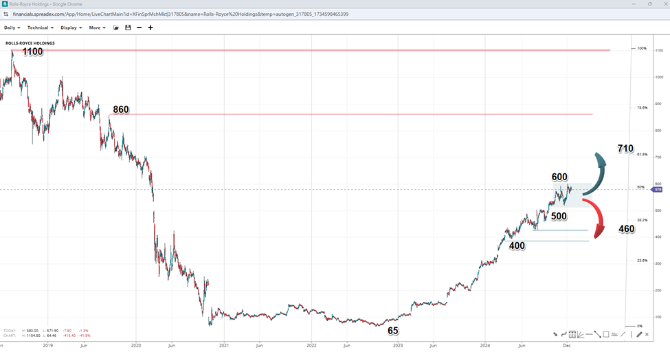 Rolls-Royce has established a solid uptrend since bottoming out at 65 GBX in October 2022, facing midway resistance at the 50% Fibonacci retracement of the 1100-65 GBX leg near the 600 GBX barrier. Above the psychological 500 GBX level, price action suggests strong momentum while trading past the swing low of 520 GBX. However, the stock faces immediate resistance at the 61.80% Fibonacci retracement at 710 GBX, with a move higher opening the door to 860 GBX. Meanwhile, support below the major round level at 500 GBX remains at the 38.2% Fibonacci retracement of 460 GBX, offering bears the potential for extended declines towards the 400 GBX handle.