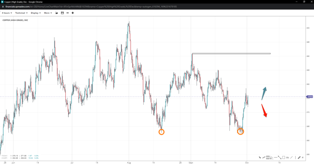 The price of copper stopped and reversed at 362, forming a double bottom and provoking long positions towards 391. Above there lies critical resistance around 400, with a support failure opening up 355 next.