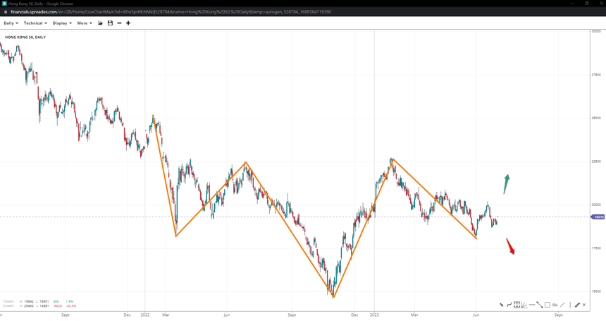 While still in correction, the HK50 index might have put a low in at 18k as part of an inverse H&S formation. Moving past 20k might open the door towards the high of 22500 and beyond, whereas a leg under the round support might see further declines towards 15k, invalidating the pattern.