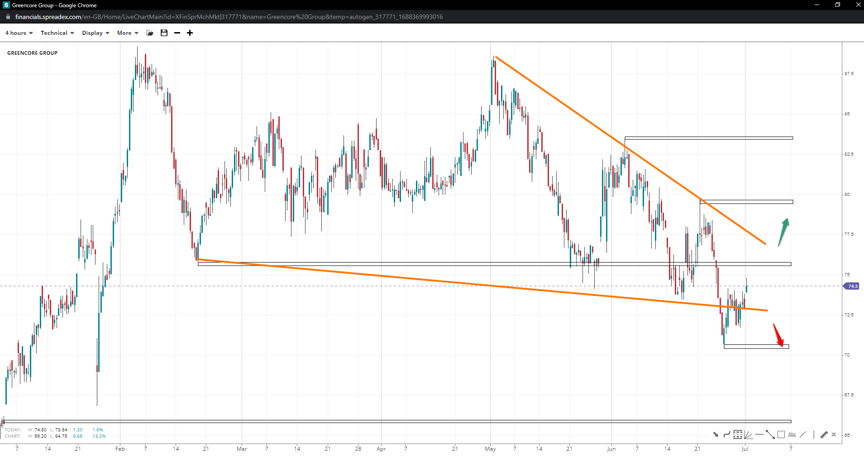 The stock price of Greencore Group might have ended a wedge pattern down at 70.50p, raising speculation that a bottom might be in and prices see further upside towards 83.50p once 75.50p and 80p give way. If the descent continues under the trough, the pattern will most probably be invalid, with the gap at 66p becoming the next major level of support.