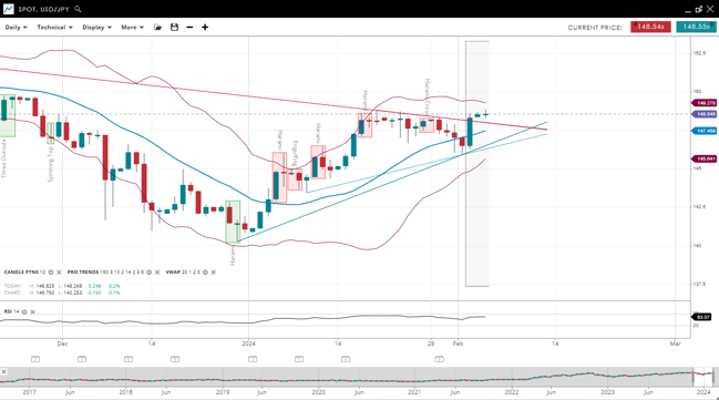 USD/JPY is in the impulsive phase of a bullish trend, with its price above the 20-period VWAP of 147.45. The support level is at 145.64, with resistance at 149.27. The RSI is at 63, indicating strong bullish momentum and potential for continued upward trend.