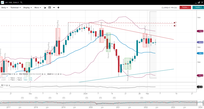 UK 100 is navigating from bearish to bullish conditions after a big impulsive move higher, with its price positioned well above the down-sloping 20-period VWAP of 7,560.4. The index's support level is at 7,411.3, with resistance at 7,709.5. The RSI is at 54, suggesting a moderate bullish momentum.