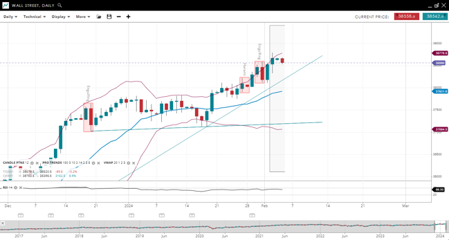 Wall Street is in the impulsive phase of a bullish trend, highlighted by its price well above the 20-period VWAP of 37,921. The support for this index is at 37,064, with resistance at 38,778. The RSI is at 66, pointing towards strong bullish momentum without reaching overbought territory.