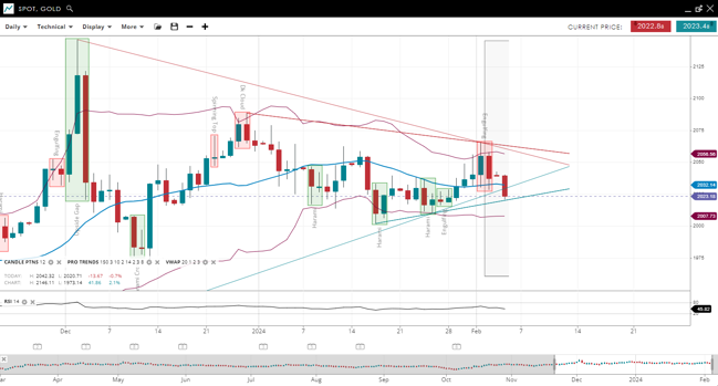Gold is also in the corrective phase of a neutral trend, with its price slightly below the 20-period VWAP of 2,032. The support level is at 2,007, with resistance at 2,056. The RSI at 45 indicates a neutral to bearish momentum, suggesting the market is assessing direction.