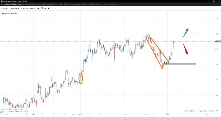 Boeing tapped the territory below the 200.00 handle to collect some stops before spiking towards what seems to be a leg above the peak of 221.00. With the flag likely complete, the upside might offer a chance at a fresh multi-month high at 230.00 unless the pattern is incomplete or we form a double top. Failing at the 200.00 barrier will increase the probability of a gap-fill at 190.00.