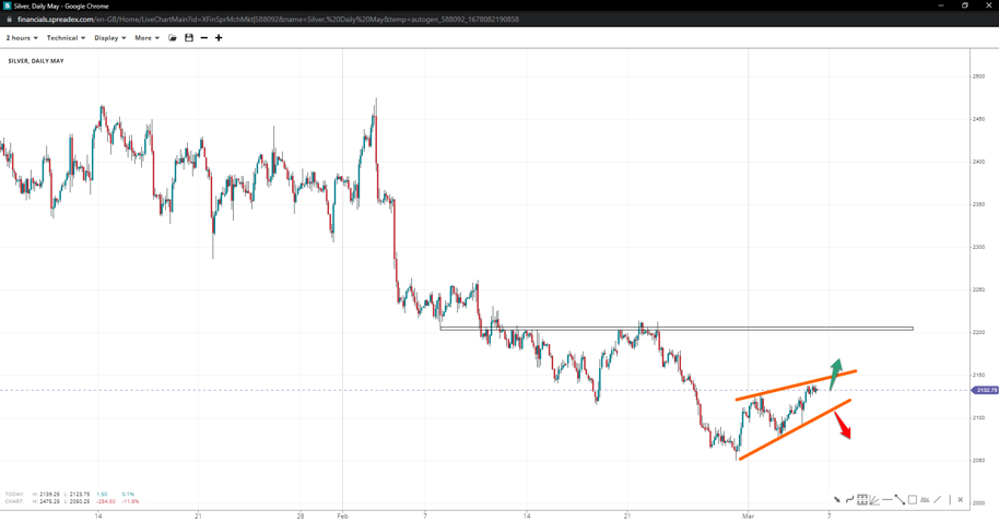 Gold bears failed to extend to the round support of 1800, with bulls taking the opportunity to engage in short-covering to 1864. If the resistance holds, the commodity could fall to 1827 and form a flag or pennant as it moves impulsively higher. However, a break past it might see added upside bias towards 1900, with 1873 a likely resistance.