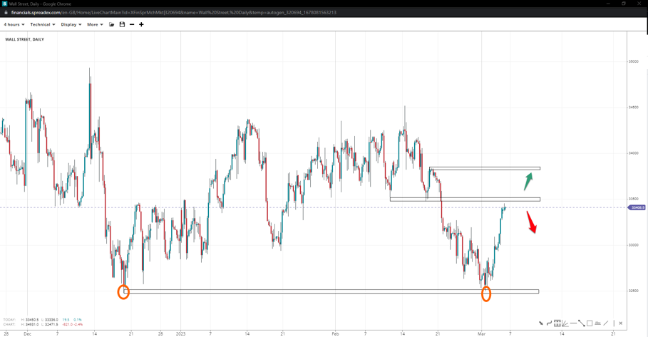 Wall Street formed a double-bottom at 32500 last week, starting an upward leg to reclaim the 33k handle. 33500 in near-term resistance above there, and 33850 a likely peak. Losing the base might expose the bottom again, with 32250 next.