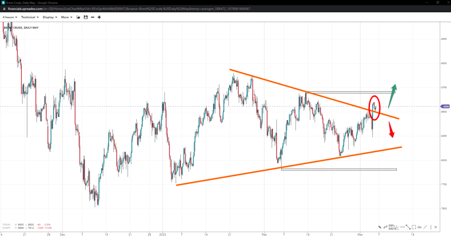 Brent continues to trade within a potential triangle pattern, but it could get invalidated above 87.00. Moving above the swing high will increase the prospect of extending gains towards 90.00 unless 89.00 acts as a stiff resistance. Crumbling below 82.30 might support the triangle case, with potential weakness below 79.00 increasing the chances of validation.