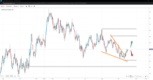 Copper formed a double-bottom following the completion of a wedge, opening up speculation for a “low-in” scenario at $3.51/lbs. If bulls persist towards the second peak at $3.91, winning over $4.02 could clear the path to higher levels. But losing the support could see prices slump towards $3.40.
