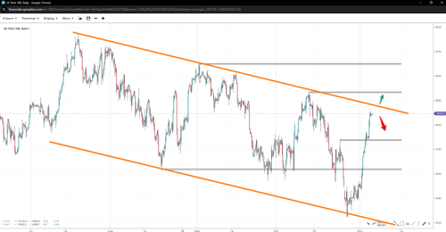 The Tech index has reclaimed the 15k handle but faces upper trendline resistance before confirming or invalidating the flag. If bulls can get past rejection peaks at 15350 and 15650, it would support the bullish thesis. Otherwise, losing the round support will expose support at 14850 and the swing low of 14555.