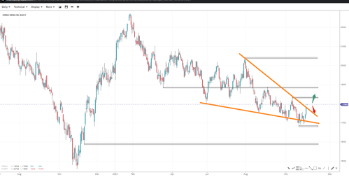 Crossing outside the descending HK50 wedge trendline exposes the peak of 18370 and 20350, with interim resistance at 18850. But if the index reverses below the regional support of 17K, it may open the door to 16K, invalidating the wedge and raising the chances of bearish impulses.