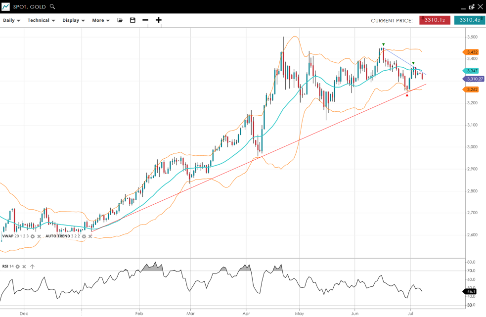 Gold remains in a neutral range-bound trend underneath record highs, currently priced at 3,310, just under its VWAP of 3,347. The RSI at 46 signals a lack of directional conviction. Support is at 3,262, with resistance at 3,432.