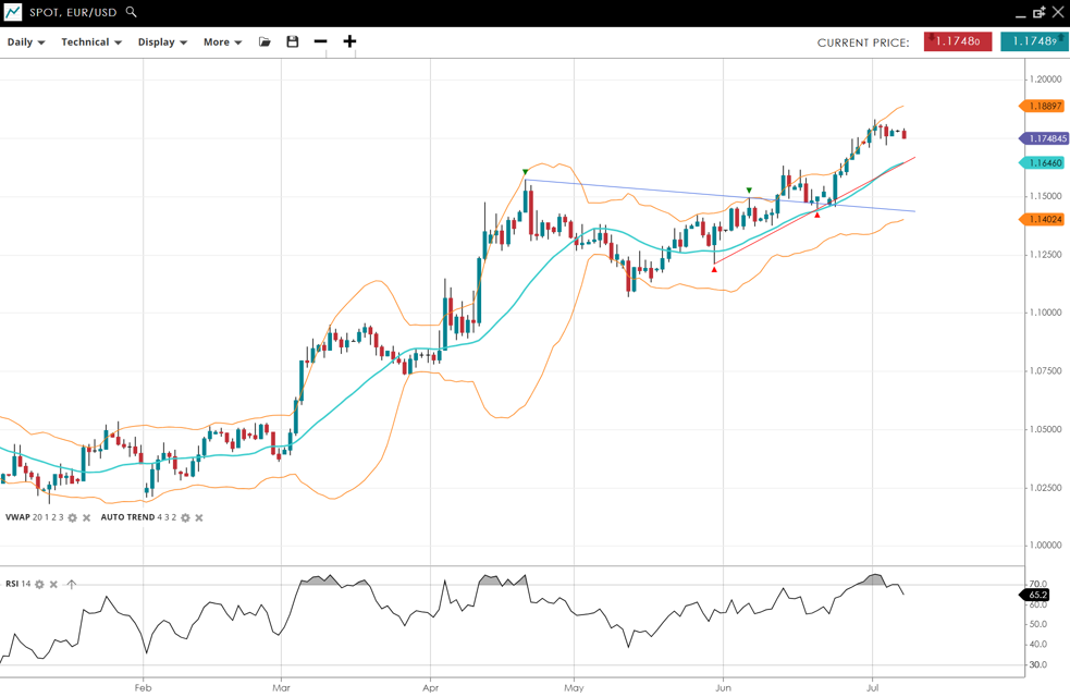 EUR/USD is bullish and in an impulsive phase, with price at 1.1748, well above its VWAP of 1.1646 and at a multi-year high. The RSI at 65 after reaching overbought conditions is a warning sign. Support is at 1.1402, with resistance extending to 1.8897.