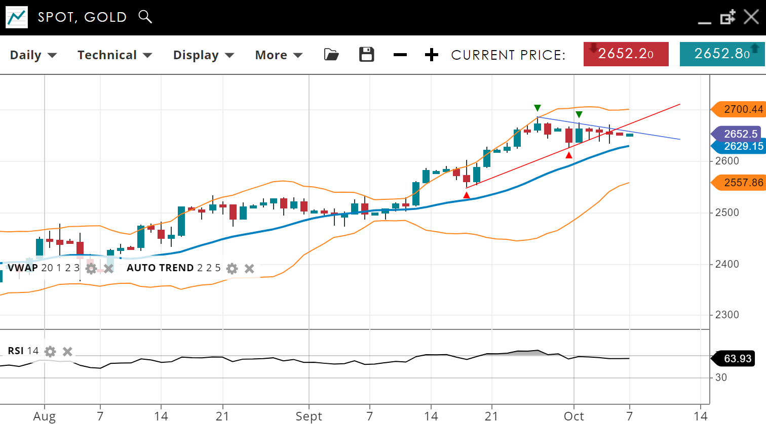Gold continues to trend upward but has entered a corrective phase - more via time than price, which has stayed in a tight range, currently at 2,652, just above the VWAP (20) of 2,629. Support is found at 2,557, while resistance is at 2,700. The RSI of 63 indicates strong bullish momentum, although a potential slowdown could occur.