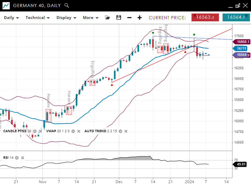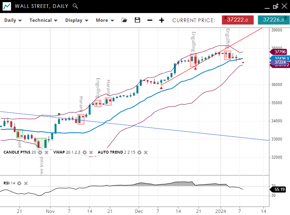 Exhibiting a bullish trend with the current price have dipped below the 20-period VWAP of 37,346 for the first time since November. It has support at 37,230 and resistance at 37,795. With an RSI of 55, the index is showing moderate bullish momentum but looks susceptible to rolling over.