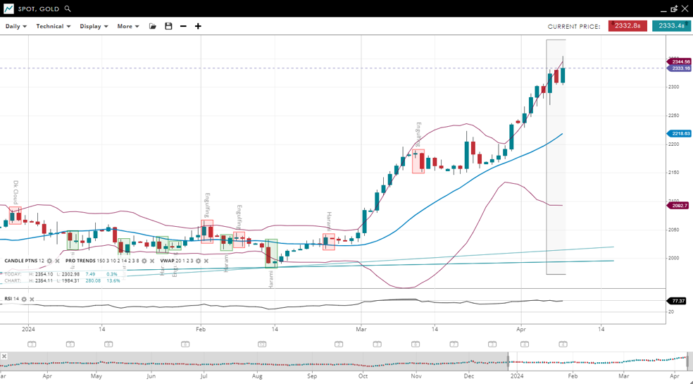 Gold continues in a very bullish trend and is still easily in the impulsive phase, with the price increasing significantly to 2,333, well above the 20-period VWAP of 2,218. The support level has been revised down to 2,092, with resistance now at 2,344. The RSI has increased to 77, reflecting an intensified bullish sentiment and a very overbought reading.