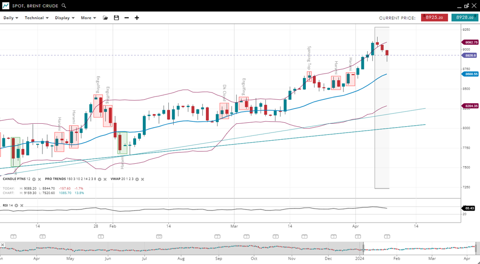 Brent Crude has continued its bullish trend in the impulsive phase, with its price increasing to 89.26, above the up-sloping 20-period VWAP of 86.88. The support level is now at 82.84, with resistance closely set at 90.92. The RSI has decreased slightly to 65, indicating a slight reduction in bullish momentum.