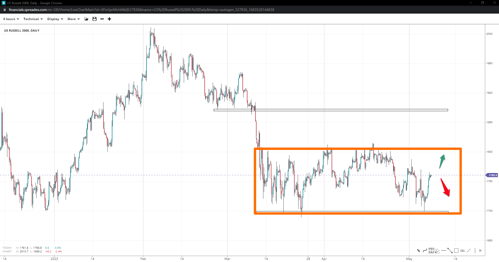 Russell 2000 has been trending lower but reached consolidation around 1700, forming a triple-bottom. If bulls take over 1800, a bullish breakout towards 1870 may be seen. Conversely, if the support breaks, increasing shorts could drive prices toward 1650.