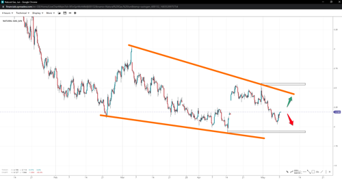 Natural gas prices dropped to 2.00 last week, resembling a terminal wedge pattern should one more leg down under 1.95 is seen. If buyers can successfully send prices back above 2.55, it could invalidate the pattern. However, a decent attempt at 2.25 will be required first, anyway. Otherwise, prices may head toward 1.90.