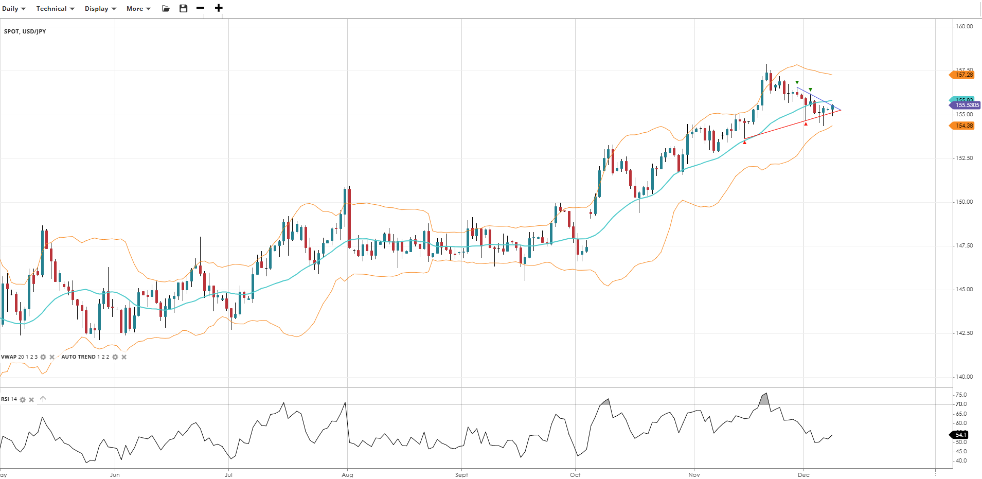 USD/JPY remains in a bullish trend but is undergoing a correction. It trades at 155.33, slightly under the VWAP at 156.88. The RSI at 54.1 shows moderate momentum. Support is at 154.38 and resistance at 157.28.