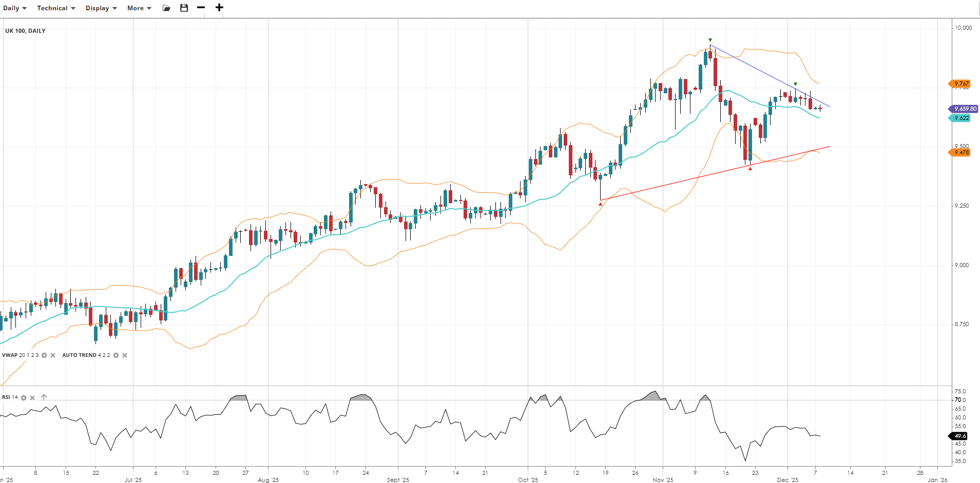 UK 100 remains in a bullish trend but is still in a corrective phase. It’s trading at 9,659, just above its VWAP of 9,622. RSI at 49.6 suggests neutral momentum. Support lies at 9,478, while resistance is at 9,757.