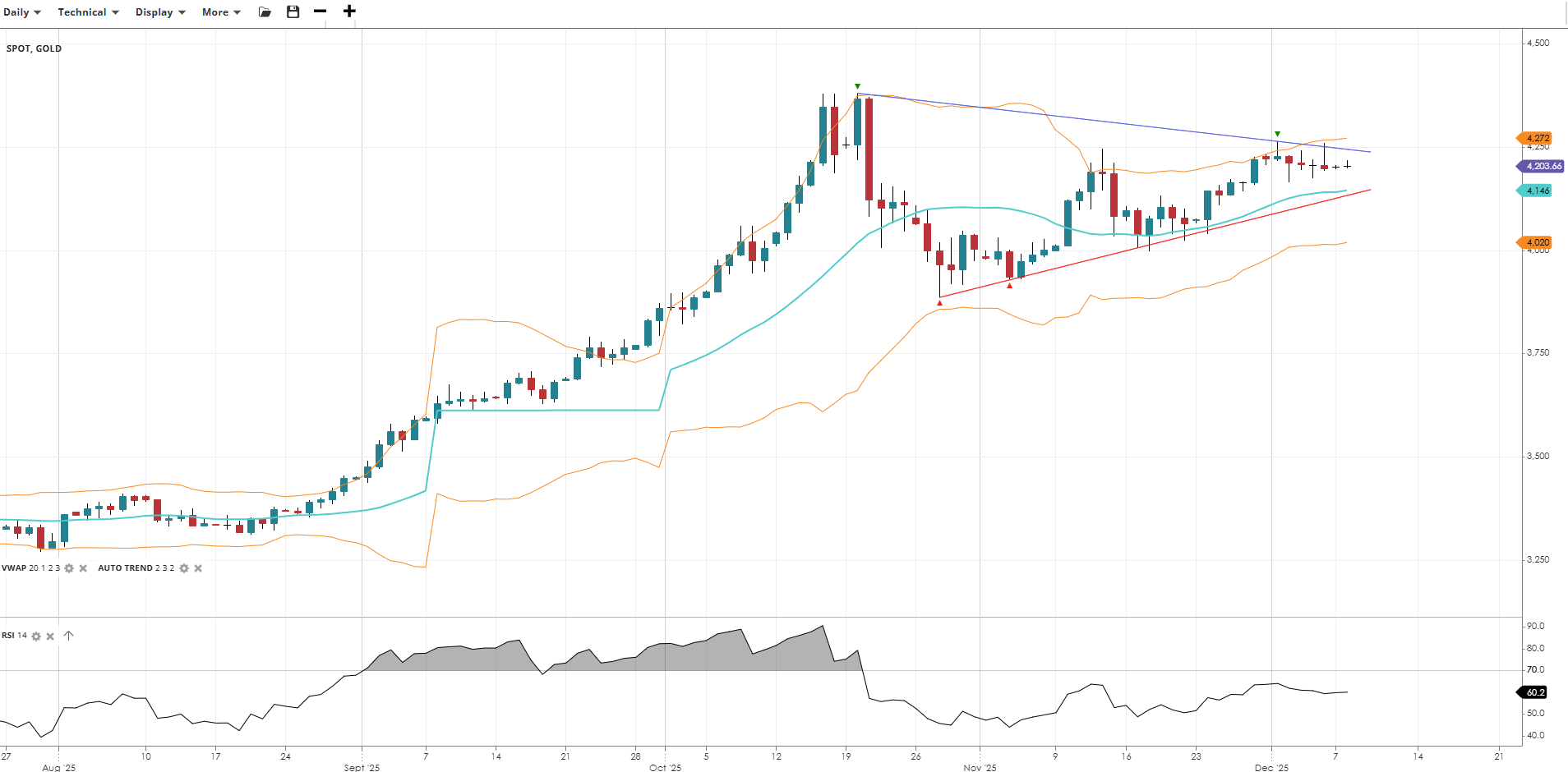 Gold has tracked sideways since breaking back over 4200, with upside momentum supported by an uptrend line, currently trading at 4,204 above its VWAP of 4,146. RSI at 60.2 indicates continued buying strength. Support is at 4,020, resistance at 4,272.