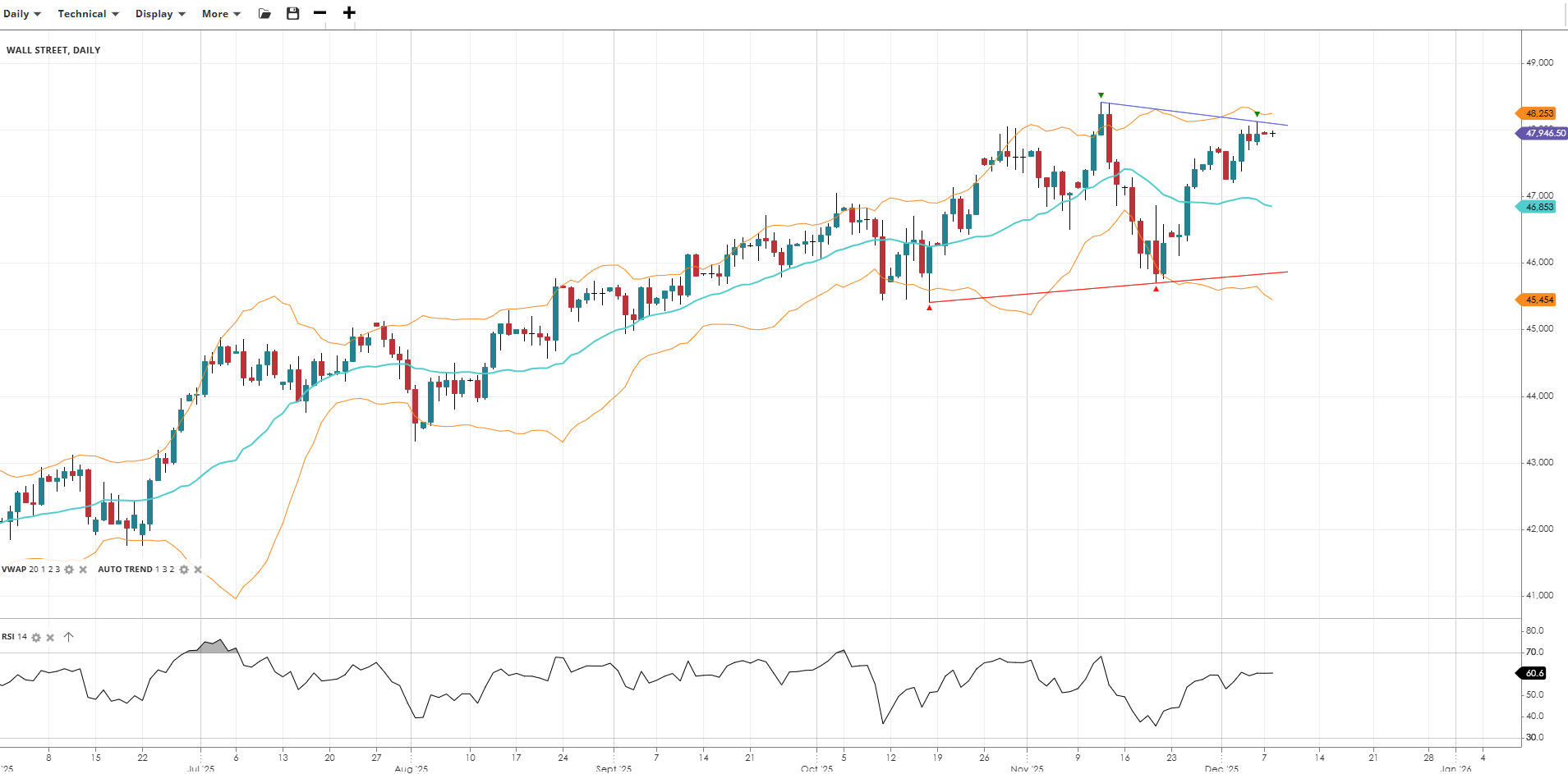 Wall Street continues in a bullish trend and is retesting all time highs, in what could see the sideways correction continue or a breakout. Price is trading at 47,947 above its VWAP of 46,853. RSI at 60.6 reflects growing bullish sentiment. Support is at 45,454, with resistance at 48,253.