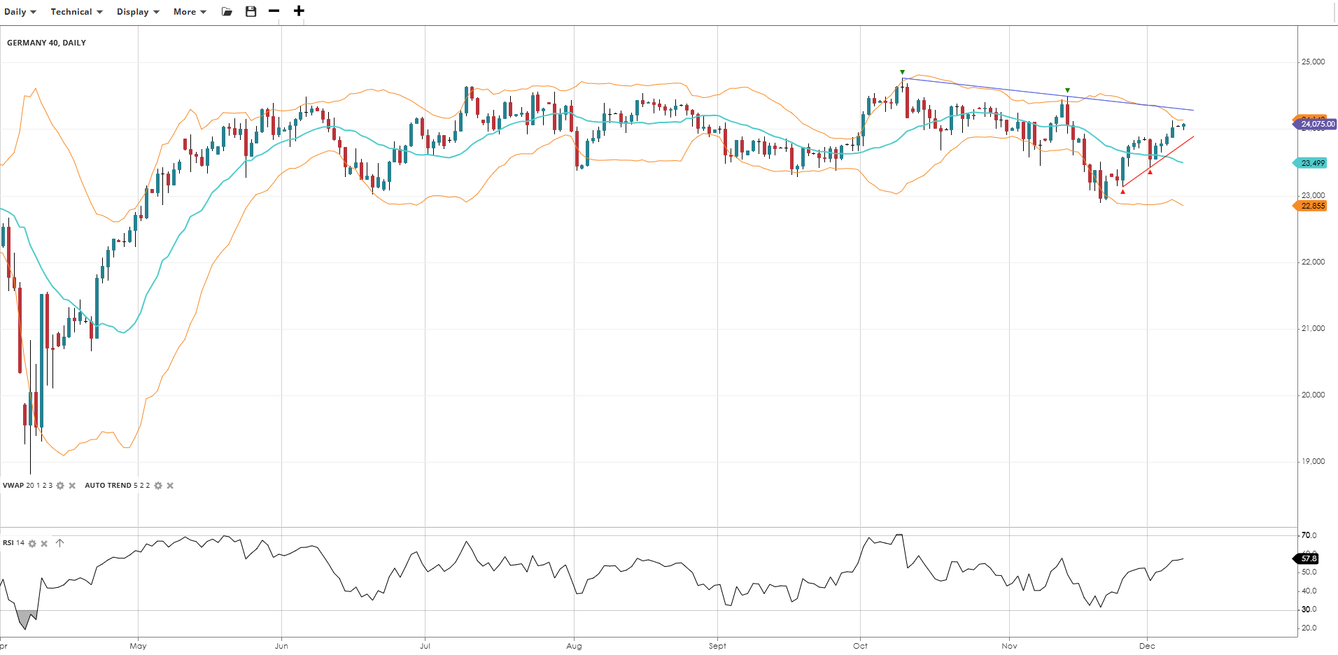 Germany 40 has continued higher over the past week but remains inside its broader range, trading at 24,075 above the VWAP of 23,499. RSI at 57.8 indicates increasing momentum. Support is found at 22,855, with resistance matching the current high at 24,075.