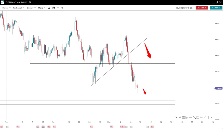 The price of GER40 posted a double top formation which led to a reversal to the downside where sellers showed strength over the buyers. This led to a breakout of the bullish trend line to the downside and now it is testing the 13555 mark. A break and close below this zone will lead to further movement to the downside, possibly to the 13,350 level.