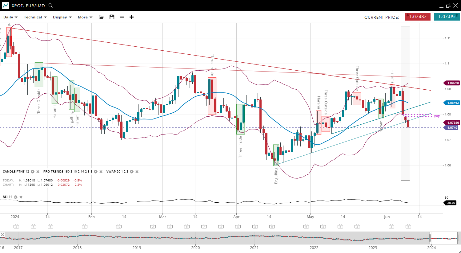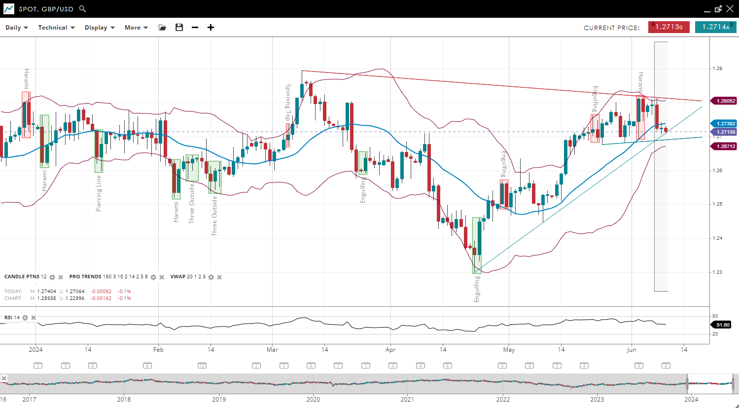 EUR/USD remains broadly trendless with the price more recently decreasing to 1.0749, now below the VWAP of 1.0846 - and indicating a possible new phase of weakness. Support has adjusted lower to 1.0768, while resistance has increased to 1.0923. The RSI has decreased to 39, indicating a significant increase in bearish pressure compared to the previous report.