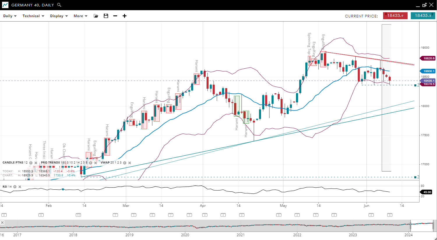 UK 100 remains in the consolidation phase of a bullish trend, with the price decreasing towards the June lows, and still below the VWAP of 8,284. Support has adjusted to 8,134, while resistance has increased to 8,434. The RSI has decreased to 42, reflecting a significant weakening in momentum compared to the previous report.