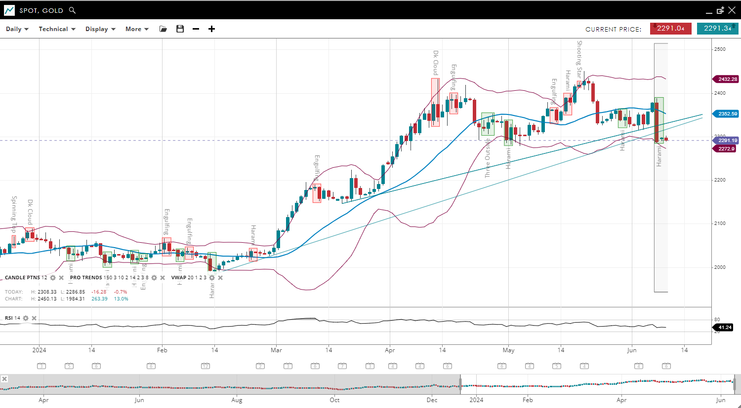 Gold is trading sideways in a neutral consolidation since topping in mid-April, with the price recently sharply falling to 2,291, now below the previous VWAP of 2,352. Support has adjusted higher to 2,272, while resistance has decreased to 2,432. The RSI has decreased to 41 alongside a big bearish engulfing candlestick on the daily chart, indicating new bearish momentum.
