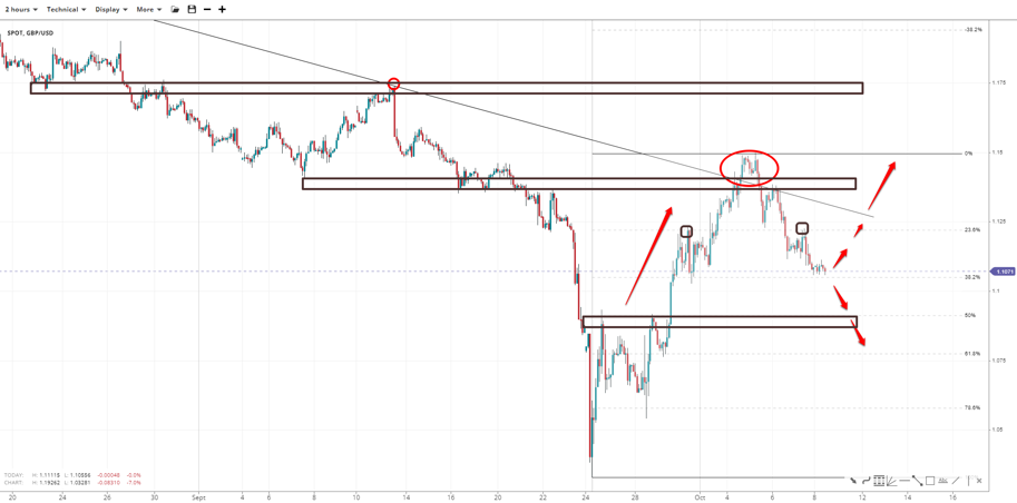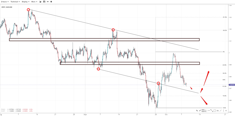 EUR/USD reaching parity brought in a large sum of sell orders, resulting in a golden correction of the 0.9535-1.000 leg at 0.9715. Below the key support lies the 78.6% Fibonacci retracement at 0.9635, where the descending trendline might meet prices. If not, the 0.9535 comes back on the cards unless the 50% Fibonacci at 0.9767 breaks. This might offer bulls a short-term opportunity to 0.9900 if the 38.2% retracement at 0.9825 breaks.