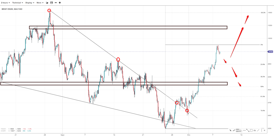 Brent oil continued its ascend but stopped ahead of 100.00 at 98.70 for what seems to be a correction. If it keeps falling, the 23.6% Fibonacci of 82.50-98.70 at 95 is short-term support, with 92.50 and 90.00 lower retracements. If the price breaks the top and the 100.00, the inverse 38.2% Fibonacci is major resistance above 102.50.