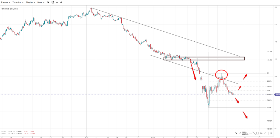 Long gilts extended to 100.00 before reversing to the golden pocket of the 91.00-100.00 leg near 95.00. Outside the base channel, the Fibonacci origin might be revisited if the 78.6% Fibonacci at 93.00 breaks. Below there, the 138.2% and 161.8% extensions lie near 87.00 and 85.00. If any of the supports above the swing low hold, gilts might accelerate towards 100.00 again. The interim resistances at 96.00 and 97.00 might first clear the path to 98.60.
