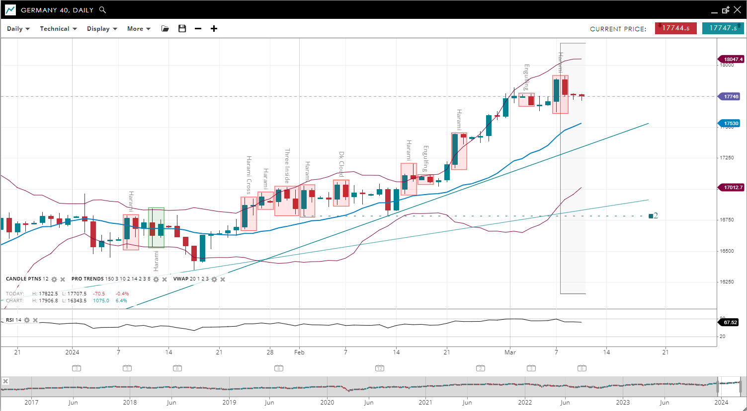 Germany 40 has maintained its bullish trend and the impulsive phase continues with a slight increase in price to 17,746, now above its upward-sloping 20-period VWAP of 17,530. The index finds new support at 17,012 and faces resistance near 18,047. The RSI has decreased to 67, indicating strong positive momentum but is no longer in the overbought territory.