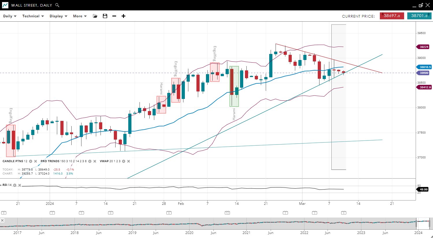 Wall Street has transitioned from the impulsive phase of a bullish trend to a corrective phase, with its price decreasing to 38,699, below the upwards-sloping 20-period VWAP of 38,818. The support for this index has adjusted to 38,412, with resistance now at 39,224. The RSI has decreased significantly to 49, indicating a reduction to neutral momentum.